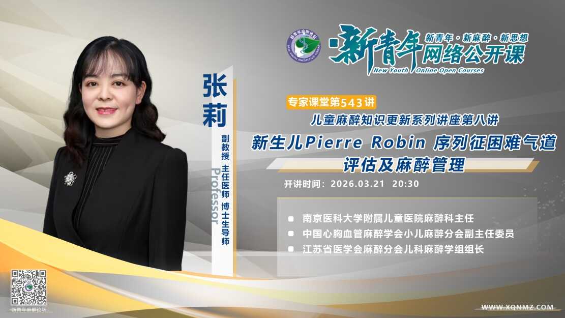 第543讲:儿童麻醉知识更新系列讲座第八讲:新生儿Pierre Robin 序列征困难气道评估及麻醉管理 (张莉 教授)