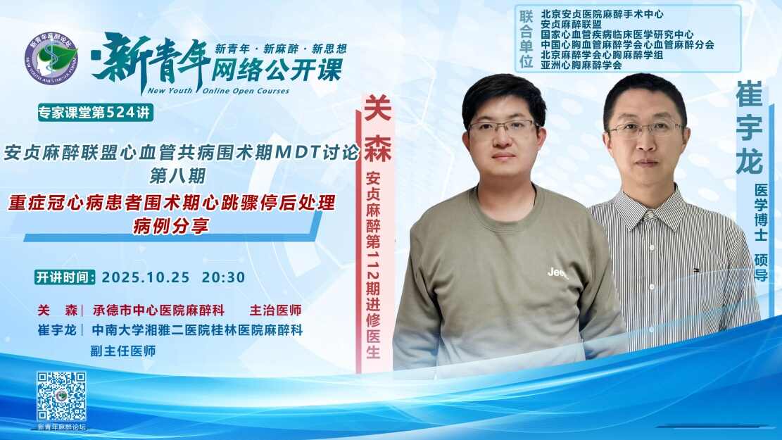 第524讲:安贞麻醉联盟心血管共病围术期MDT讨论第八期 :重症冠心病患者围术期心跳骤停后处理病例分享(关森 主治医师 &崔宇龙 副主任医师 )